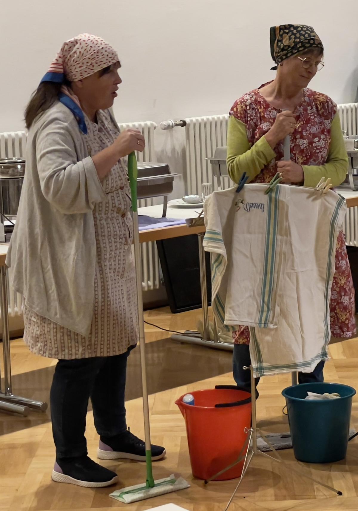 Die beiden Putzfrauen Frieda und Marie aus Wendlingen lieferten mit ihrem Kirchenkabarett einen flotten Überblick über das Leben in der katholischen Kirche Esslingen in der Zeit des erzwungenen Umbruches.